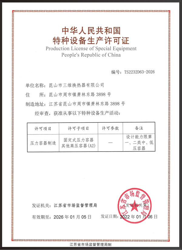 昆山市三維換熱器有限公司注冊資本5000萬元,資產2.1億元,公司地址位于江蘇省昆山市周市鎮(zhèn)蕭林東路3898號,法人代表為顧安生,公司設有技術部、生產部、檢驗部。